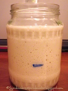 Al mattino era molto lievitato. Ho filtrato ancora l'acqua di pesca, l'ho aggiunta al lievito, mescolato bene con una piccola frusta, unito la farina e messo in un vaso di vetro piccolo. Ho coperto sempre col piattino e riposto nel mobiletto delle farine.
