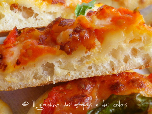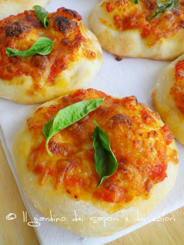 Al mattino seguente, fare le pieghe all'impasto e lasciarlo qualche minuto coperto. Tagliare in 8 pezzi di circa 50 g cadauno e lasciare coperti per un'ora. Quindi con le mani modellare le pizzette, non troppo basse (circa 1 cm di spessore) spalmare il sugo di pomodoro e la mozzarella. Io per cuocerle ho usato il fornetto per la pizza ma credo che anche nel forno normale, a temperatura massima, cuociano perfettamente.