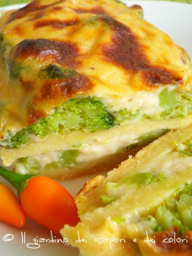 Rivestire con uno strato di panissa una pirofila leggermente unta delle dimensioni di circa 21×16 cm, cospargere con qualche cucchiaio di broccoli, dai quali avrete eliminato l’aglio, distribuendoli bene, e ricoprite con metà besciamella.