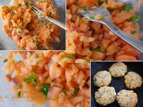 Ho fatto delle palline le ho passate nella farina e poi le ho schiacciate ad hamburger. Ho cotto in una padella antiaderente con un filo d'olio.