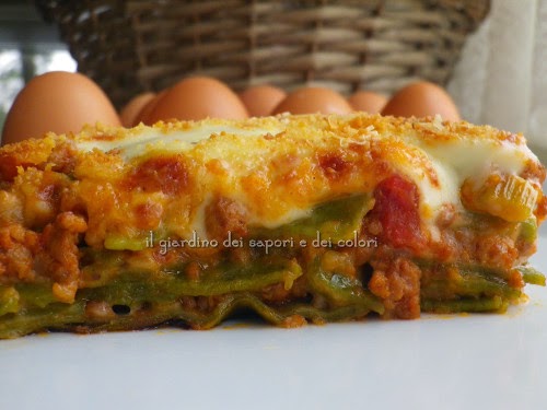 Un classico della cucina italiana-emiliana: Le lasagne verdi emiliane, preparata in modo eccellente dalla nostra amica Susanna del blog Afrodita's kitchen con una gustosissima variante che aggiunge un tocco appetitosissimo al piatto: la crosticina di pangrattato sulla superficie.