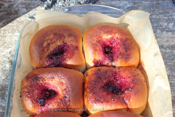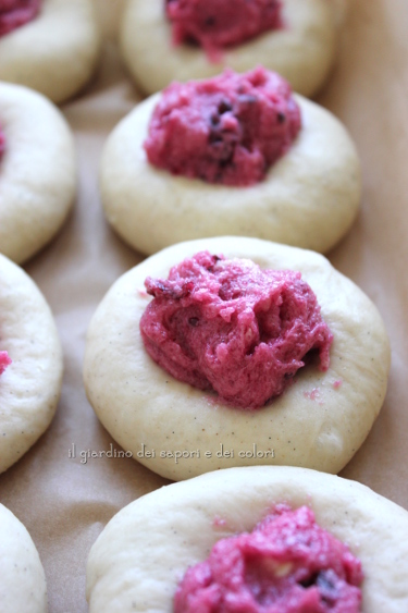 Dopodiché ho formato 8 palline, con le dita ho fatto un buco al centro e disposto un cucchiaino di composto preparato mescolando il burro morbido con lo zucchero e la confettura. Ho disposto le brioche nella teglia rivestita con carta da forno.