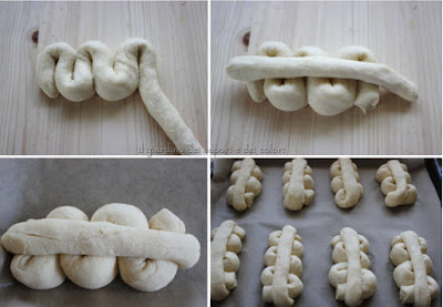 Inserire nella ciotola della planetaria, licoli, lo zucchero, le uova a temperatura ambiente, il latte tiepido. Mescolare ed aggiungere le farine setacciate. Impastare fino ad incordatura, quindi unire il burro e poi il sale. Incorporare bene, fare una palla, coprirla con un pezzo di carta da forno e poi con la pellicola e metterla a lievitare fino al raddoppio. Io l'ho lasciata per qualche ora a temperatura ambiente, poi siccome il caldo sta iniziando a farsi sentire ed era notte fonda, l'ho riposta in frigo. Al raddoppio pesare 10 pezzi da circa 120 g e formare dei panini tondi oppure a forma di mafalde, come mostra la foto. Non vi so dire se il procedimento è giusto..ma sono riuscite!
