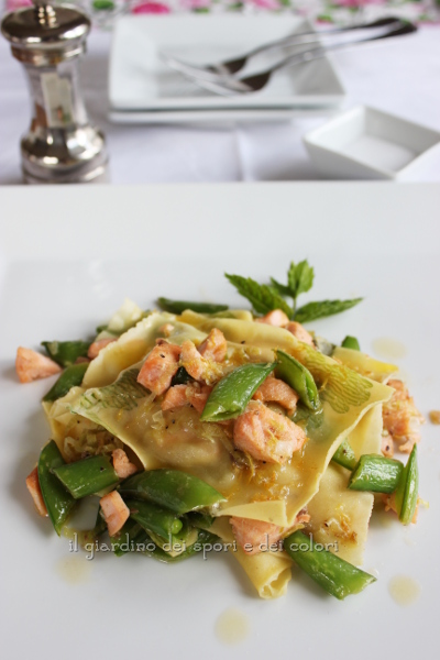 Oggi, domenica, ho tagliato a rondelle sottili il porro, fatto appassire con due cucchiai di olio e una noce di burro, aggiunto i piselli tagliati in tre parti. Lasciato rosolare, sale e pepe, tolto dalla padella e messo da parte. Nella stessa padella, con un po' di olio ho rosolato i pezzettini di salmone. A fine cottura, ho spremuto sopra neanche mezzo limone, sale e pepe. Ho unito al salmone le verdure preparate precedentemente e fatte saltare qualche secondo in padella. Insaporito con menta fresca. Nel frattempo ho cotto i quadrotti di lasagne in acqua bollente salata. Scolati e serviti in un piatto alternando i quadrotti con il condimento al salmone. Per finire ho rosolato un po' di burro e grattato sopra un po' di scorza di limone. Condito e mangiato :-)