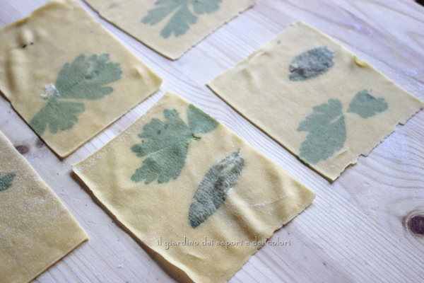 Il giorno prima ho preparato la pasta mettendo le due farine nella ciotola della planetaria, unito le uova e acqua quanto basta fino ad ottenere un impasto abbastanza duro. Per finire ho impastato un po' a mano, coperto con la pellicola e lasciato riposare mezz'ora. Trascorso questo tempo ho steso due sfoglie alla volta impostando, come ultimo passaggio usando farina per non farle attaccare, la tacca nr 6. Sopra la prima sfoglia vi ho disposto le foglioline di prezzemolo e menta pressando un po' per farle aderire. Sopra a questa ho adagiato l'altra sfoglia, pressando ancora per farla aderire e ripassato nella macchina sempre nella tacca nr6.