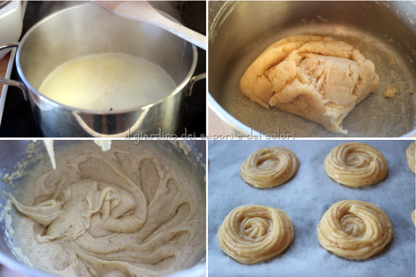 Bollire il latte con la vaniglia, aperta in due nel senso della lunghezza, il burro ed il sale. A bollitura, togliere la vaniglia, versare le farine, precedentemente setacciate insieme. Mescolare energicamente e continuamente fino ad ottenere un composto come si vede nella foto sotto.