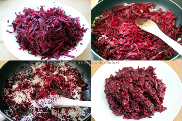 In una padella, rosolare la cipolla tritata con qualche cucchiaio di olio. Aggiungere le rape rosse tritate. Io ho preferito tritarle crude,(attenzione agli schizzi!!) ma la ricetta originale le prevede cotte.