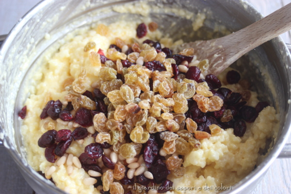 Aggiungere al riso freddo le uova, i mirtilli, l’uva passa strizzata dal rhum,