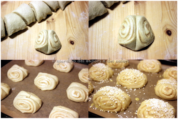 Tagliare a pezzi come nella foto e con in dito (io ho usato una bacchetta per mangiare giapponese) schiacciare il centro. Mettere a lievitare coperti.