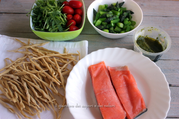 Cuocere le fettine di salmone al vapore oppure alla piastra o alla brace. Togliere la pelle del pesce e tenere da parte. Cuocere la pasta in abbondante acqua salata, scolare e passare sotto l'acqua fredda per fermare la cottura. Lavare la rucola e tagliare i pomodorini a metà.
