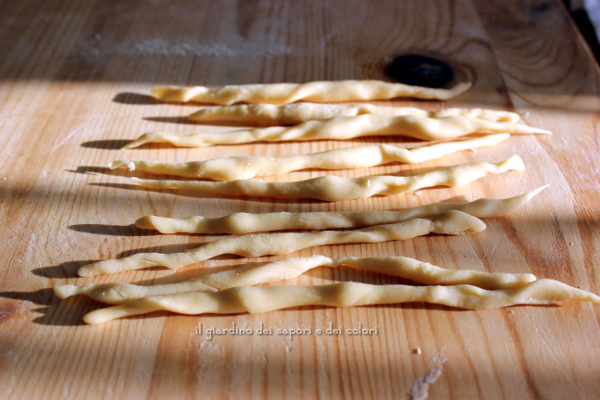 Per questione di tempo ho impastato con la planetaria, versando nella ciotola, la farina, l'acqua ed il sale. Ho avviato e lasciato impastare a lungo finché l'impasto non è diventato liscio e compatto. Ho coperto con la pellicola e ho lasciato riposare per mezz'ora. Dopodiché ho seguito questo video per fare le trofie.