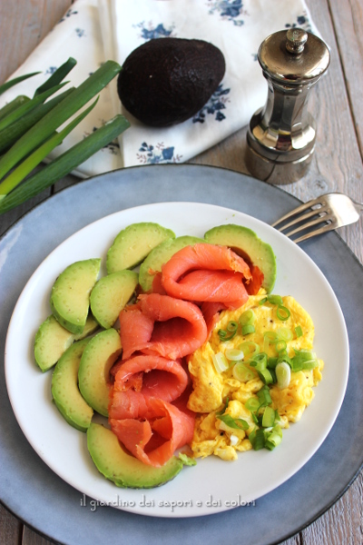 Sbattere l'uovo con una forchetta, aggiungere l'acqua fredda, sale e pepe. Sciogliere un poco di burro in una padella antiaderente, non deve scurire, solo sciogliersi. Versare l'uovo e, con una spatola, girarlo sotto sopra. Non ha importanza se l'uovo non rimane intero, tipo frittata, ma non deve prendere colore. Cuocere per qualche secondo anche dall'altra parte. Impiattare, cospargere di cipollotto tagliato finemente. Sistemare nel piatto anche il salmone e l'avocado irrorato con qualche goccia di succo di limone.