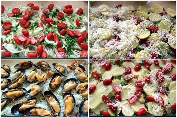 Lavare alcune volte il riso per togliere un poco di amido e distribuirlo sopra le patate. A questo punto, sistemare sopra le cozze, il rimanente trito di aglio e prezzemolo, i pomodorini tagliati a metà ed il resto delle patate.