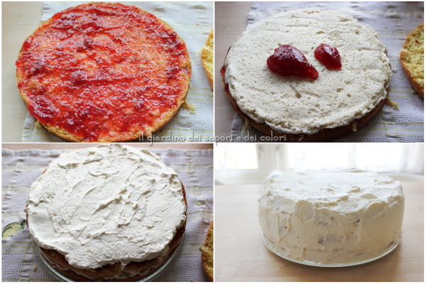 Sopra la base spalmare un po' di confettura di fragole. Coprire con il disco di macaron. Sopra a questo spalmare ancora confettura e, sopra la confettura, uno strato di panna montata. Appoggiare sopra l'altro disco, spalmare di confettura e poi uno strato di panna. Sistemare l'ultimo disco e spalmarvi sopra e dai lati il resto della panna.