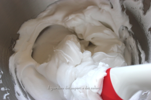 Rivestire con la carta da forno lo stampo da 26 cm di diametro e versare il macaron. Cuocere per circa un'ora. Lasciare raffreddare nello stampo. Sformare e togliere con attenzione e delicatezza la carta da forno per non romperlo.Iniziare con la farcitura. Qui ho tribolato e non poco perché, cosa molto strana per la Norvegia, fa un caldo proprio anomalo e ho dovuto fare di fretta perché la panna si squagliava..Comunque ci sono riuscita!
