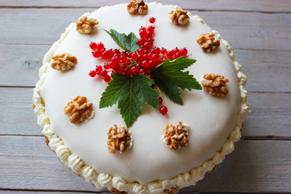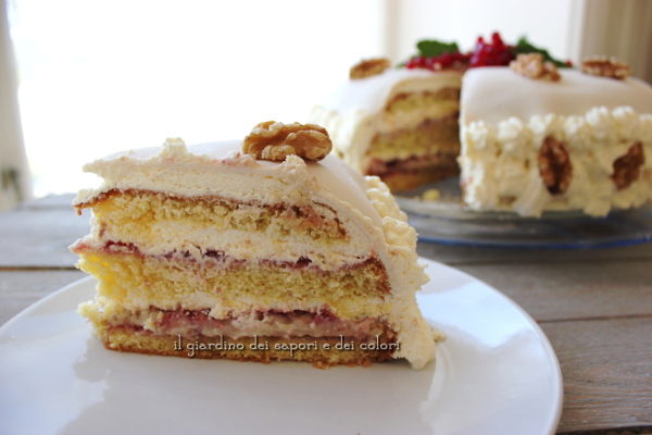 Sistemato il marzapane sopra la torta, guarnire con noci e, come spiega la ricetta originale, con fiori di marzapane. Io ho preferito la frutta del mio giardino :-)
