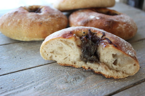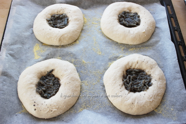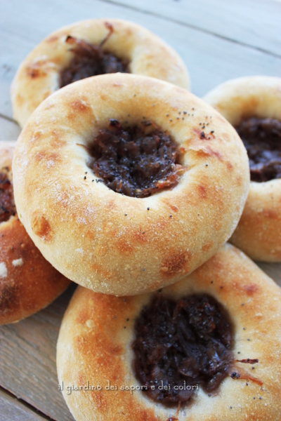Dopo questo, pressare ancora un po' al centro di ogni bialy con le dita, premendo dal centro verso l'esterno, lasciando un bordo di circa 2 o 2 cm e mezzo. Mettere un cucchiaino circa di cipolla nel foro centrale di ogni bialy e spolverare con semi di papavero.