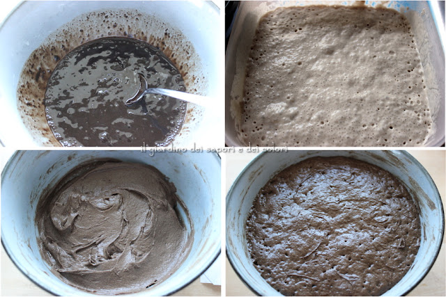 Sciogliere la melassa nell'acqua tiepida e versare nel primo impasto, mescolare ed aggiungere le farine,  ed il sale. Mescolare bene per incorporare tutti gli ingredienti. Coprire con la carta forno uno stampo per pane in cassetta e versare a cucchiaiate l'impasto.