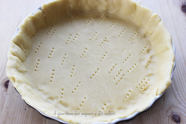 Imburrare uno stampo e trasferire la sfoglia bucherellando un po' il fondo con i rebbi di una forchetta.