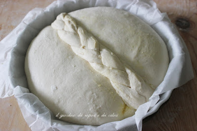 Seconda lievitazione: lasciare lievitate a a temperatura ambiente. Io l'ho messo in una pirofila rotonda, con della carta da forno.