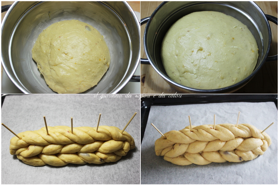 (Dato che durante la lievitazione le trecce tendono a spostarsi, sarebbe opportuno infilzare in alcuni punti le tre trecce con degli stecchini di legno per bloccarle, da togliere appena possibile).