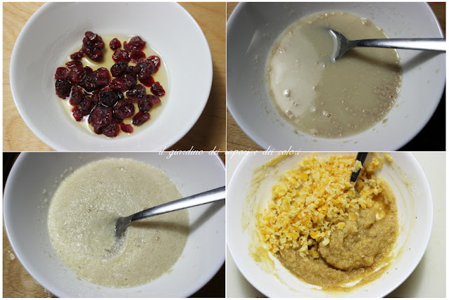 Nella ciotola della planetaria unire il latte, il succo d'arancia, lo zucchero, la vaniglia, il tuorlo, l'arancia candita frullata, i mirtilli rossi con il rum, il lievitino e mescolare.