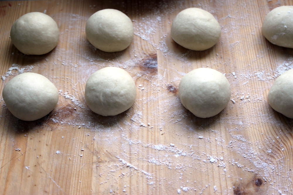 Dividere l'impasto in 8 parti uguali e formare delle palline, coprire e lasciar riposare per 5 minuti.