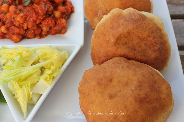 Li ho accompagnati con una versione velocizzata di"Chole Bhatura" , usando ceci in scatola. Questi fantastici panini fritti, sono talmente soffici che non sono riuscita a tagliarli con il coltello ma li ho aperti con le mani.