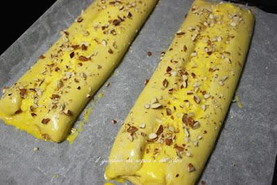 Preriscaldare il forno a 200°C e , trascorso il tempo di lievitazione, spennellare i dolci con uovo sbattuto con un po' di latte e cospargere di mandorle tritate grossolanamente. Cuocere per circa 25-30 minuti o fino a cottura. A piacere, si può sbattere dello zucchero a velo con un po' di acqua e decorare il dolce.