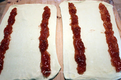 Stendere la sfoglia in due rettangoli di circa 20 x 40 e inserire una striscia di confettura come di vede nella foto.
