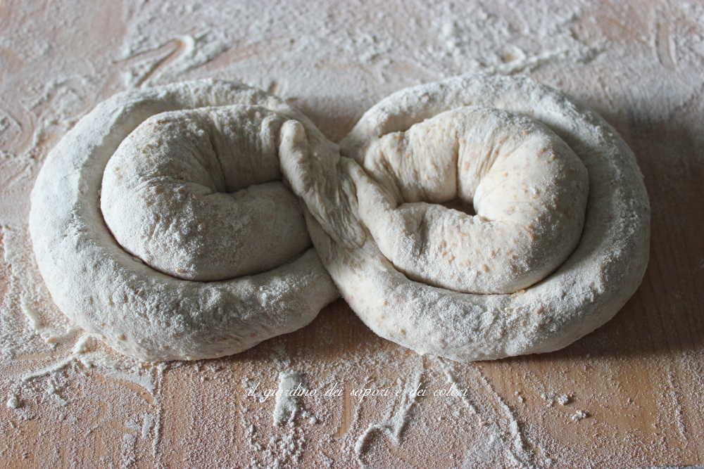 Il mattino seguente versare licoli e circa il 90% dell'acqua nella ciotola della planetaria, aggiungere la biga e mescolare. Unire la farina e impastare per circa 10 minuti. Poi versare la rimanente acqua e farla incorporare. Frullare le arachidi e aggiungere la farina ottenuta all'impasto. Formare una palla e mettere a lievitare