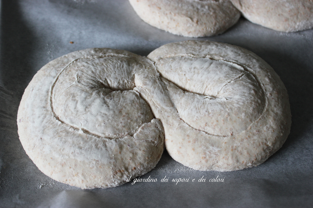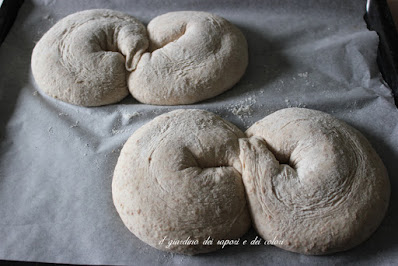 Coprire e lasciare lievitare al caldo per un'ora circa. Preriscaldare il forno a 250°C. Per evitare che prendendoli in mano per girarli si afflosci l'impasto ben lievitato, ho coperto i due pani prima con carta forno e poi un'altra placca da forno sopra, quindi ho girato velocemente e a colpo sicuro per non farli spostare.