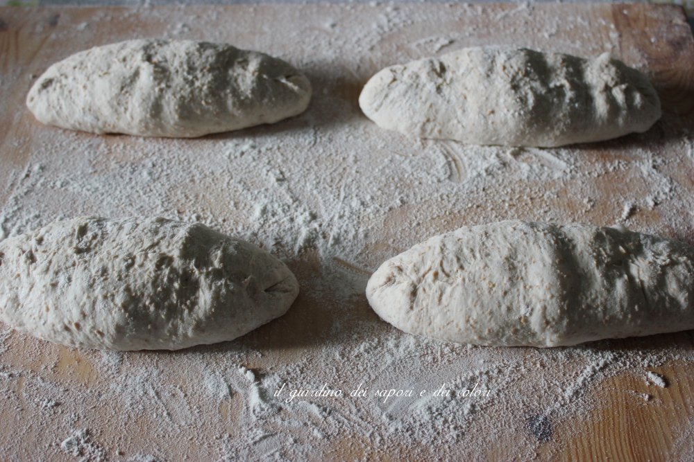 Infarinare il piano di lavoro e dividere l'impasto in 4 pezzi di circa 240 g l'uno, coprire e lasciare riposare per 20 minuti. Fatto questo, formare ogni pezzo in un "batard". Vedere
