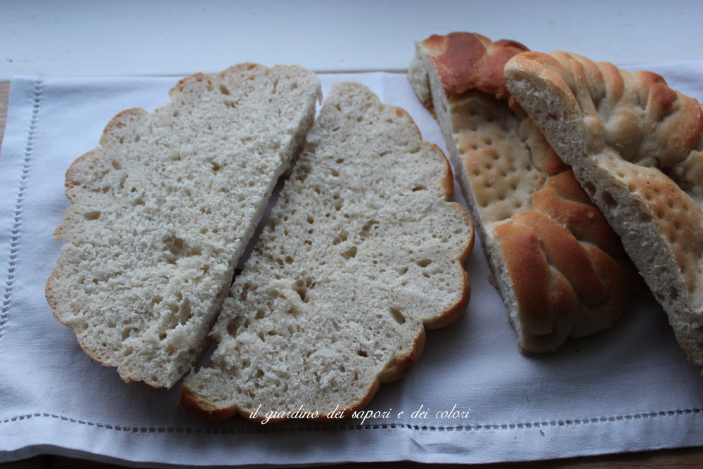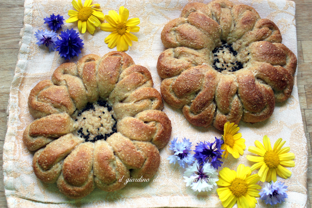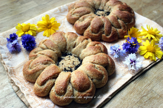 Questo pane è bellissimo secondo me. Sarà che amo svisceratamente i fiori ma a vederlo così "petaloso" mi emoziona, come quando scopro un nuovo bocciolo nel mio giardino. Adesso l'inverno è alle porte, tutta la magia dei colori e dei profumi hanno lasciato il posto alle tinte marroni delle foglie cadute dagli alberi e delle erbacce secche che ricoprono i prati, grigie dei cieli plumbei, e molto presto, bianche e azzurrognole della neve e del ghiaccio...