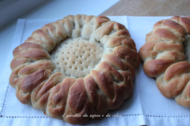 Sgonfiare l'impasto e dividere in due pezzi, formare due palle, coprire e lasciare riposare per 10 minuti. Dopodiché, stendere gli impasti a forma rotonda con uno spessore di circa un cm e mezzo, con un bicchiere o un coppapasta fare un cerchio al centro, senza incidere fino alla base. Tagliare a striscioline di numero pari la parte esterna al cerchio e intrecciare nel modo che più piace e che suggerisce la fantasia. Io ho seguito i suggerimenti della Cuochina.