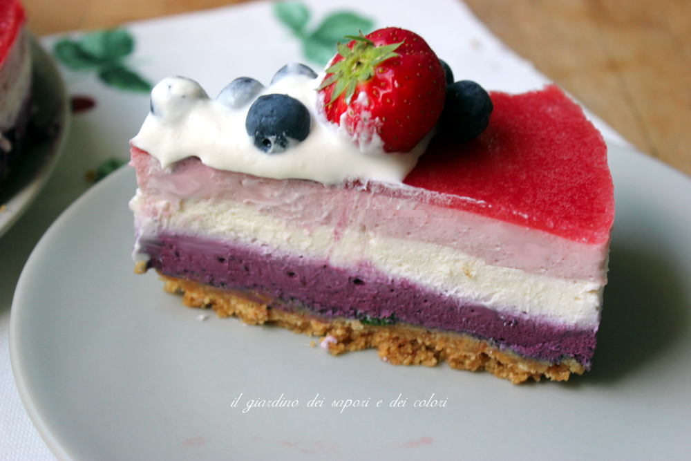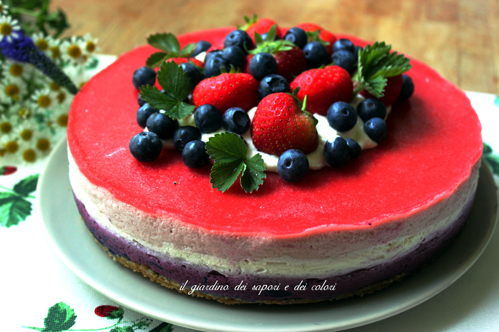 Cheesecake ai mirtilli e lamponi con glassa di fragole